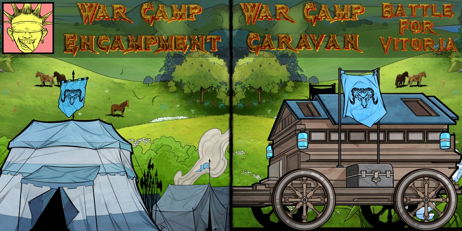 There are two forms that a war camp can take. The initial starting form is an Encampment. As an encampment the war camp can Deploy units within its surrounding borders. As a game session progresses, players can have their war camp Convert into the alternate Caravan form. As a caravan the war camp is able to Move around the battle map. However, this conversion also means that the war camp loses the ability to deploy units until it converts back into an encampment.
